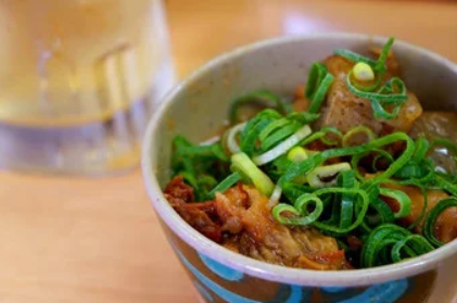 꼬치 커틀릿과 함께 오사카 명물의 「도테야키」도 어떻습니까. 된장 맛의 모츠에 차분한 맛이 스며들고 있어 낮부터 술이 진행됩니다.