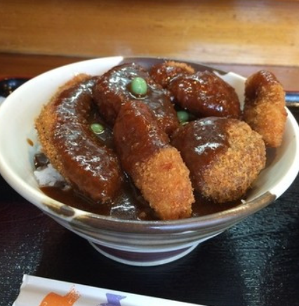 흥미 진진한 오리지널 소스가 듬뿍 뜨겁게 올려 갓 커틀릿이 쌓이지 않는 소스 커틀릿 덮밥. 온천 계란을 무너뜨리면서 받습니다. 테이블에 준비된 산초를 뿌려 먹으면 또 다른 맛을 느낄수 있습니다.