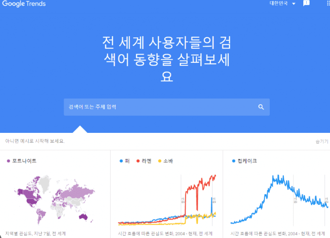 - 구글 트렌드 : 구글에서 제공하는 키워드 분석 도구로, 입력한 키워드의 검색량 변화 추이, 지역별 검색량 비교, 관련 키워드 및 주제 등을 제공한다.
