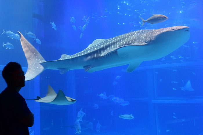 카이유칸의 볼거리는, 뭐니뭐니해도 많은 물고기가 수영하는 대수조. 동관에서 1번 인기인 고래상어가 유유히 헤엄치는 거대한 수조는 바로 압권입니다.