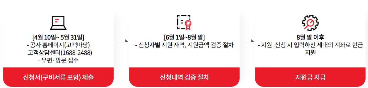 - ② 기본요금 감면 적용 대상 임대아파트 세대는 ’22년 12월 ~ ’23년 3월 세대 기준 기본요금 감면액은 차감하고 지급합니다.(장기공공임대아파트 거주 세대만 해당)