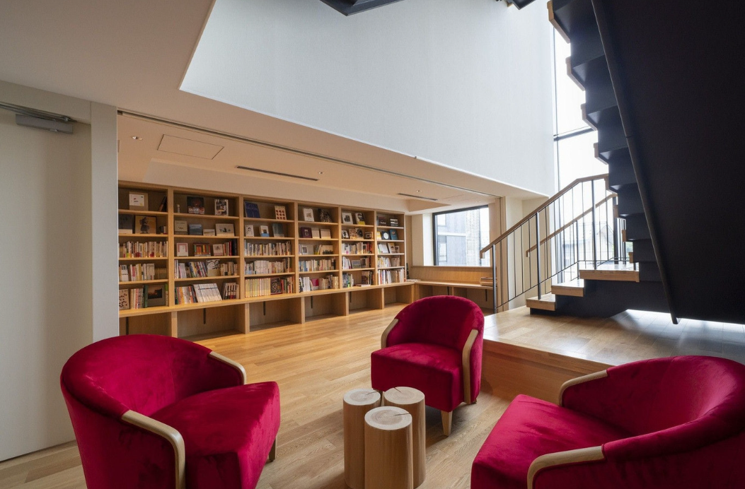 호텔은 2층에서 5층에 걸쳐 숙박객 전용 공간 '아와이 사이'를 준비하고 있습니다. 책, 레코드, 보드 게임을 즐길 수 있습니다. 2~3층은 BOOK(북) 지역. 교토에서 서점 「성광사」를 운영하는 북소믈리에의 호리베 아츠시씨가 셀렉트한 다양한 장르의 책들이 늘어서 있습니다.