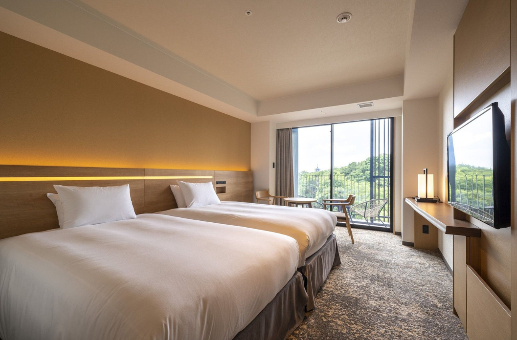 이곳은 객실의 예 "가든 트윈". 창가와 테라스에서 둘이서 녹색을 바라볼 수 있습니다. 세면대도 넓고, 우유 비누나 관내복 등 어메니티가 충실합니다. 넓은 욕실에 들어가고 싶을 때는, 호텔에서 도보 약 1분의 장소에 있는 목욕탕 「포테유」에 수건을 가지고 외출해보세요~