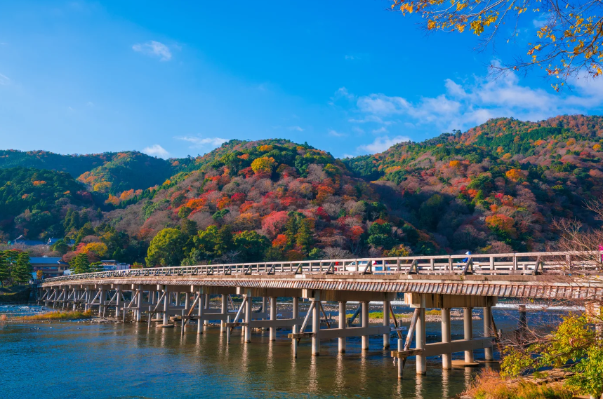 봄은 벚꽃, 가을에는 단풍의 명소로도 유명한 "아라시야마". 그런 아라시야마의 눈앞을 흐르는 오오이가와에 가는 것이 폭 11m, 길이 155m의 '도게츠교'입니다. 아라시야마의 상징인 도츠키바시는 관광 시즌이 되면 주변이 사람이나 차로 혼잡할 정도로 많은 관광객이 방문하는 인기 명소가 되고 있습니다.