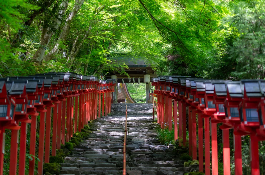 에마의 발상지이기도 하고, 인연결합의 파워 스폿으로서도 인기가 높은 「키후네 진자」. 교토역에서 직통 버스는 나오지 않으므로, 택시, 혹은 지야마 전철의 키부네구치역에서 버스로 환승해 갑시다. 여름의 피서지로서 방문하는 사람도 많고, 본궁에 이어지는 길에서는, 깨끗한 녹색 속에 둘러싸인 아름다운 돌계단과 화려한 주홍색의 등편이 마중 나옵니다.