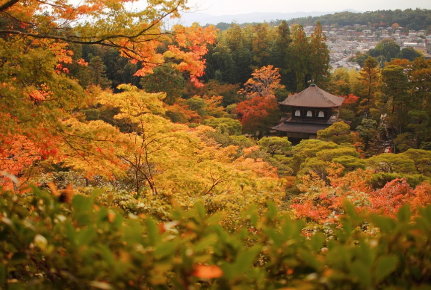 긴카쿠지의 뒷편, 월대산을 오른 곳에 있는 「전망소」에서는 경내를 한번에 바라볼 수 있습니다. 은각은 물론, 교토시내에서 멀리 있는 산들까지도 눈에 비추기 때문에, 사계절의 변화를 느끼고 싶을 때에는, 꼭 다리를 늘리고 싶은 포인트입니다. 분명 대자연의 박력에 압도되는 것 틀림없음! 작은 고민도 잊을 수 있을 것 같습니다.