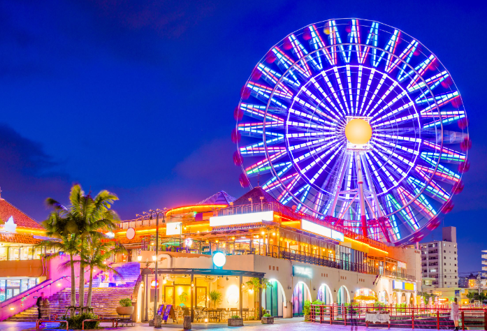 아메리칸 빌리지는 오키나와의 현대적인 면을 보여주는 곳입니다. 아메리칸 빌리지는 미군 기지 근처에 위치하고 있으며, 미국의 문화와 분위기를 느낄 수 있습니다. 아메리칸 빌리지에는 쇼핑몰, 레스토랑, 바, 영화관 등 다양한 엔터테인먼트 시설이 있습니다. 아메리칸 빌리지의 상징은 페리스 휠로, 밤에는 화려한 조명이 켜집니다.