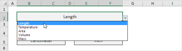 * 설명: 이 드롭다운 목록 에서 길이를 선택했으므로 이제 B5 셀과 E5 셀 의 종속(동적) 드롭다운 목록 에 길이 단위가 포함됩니다.