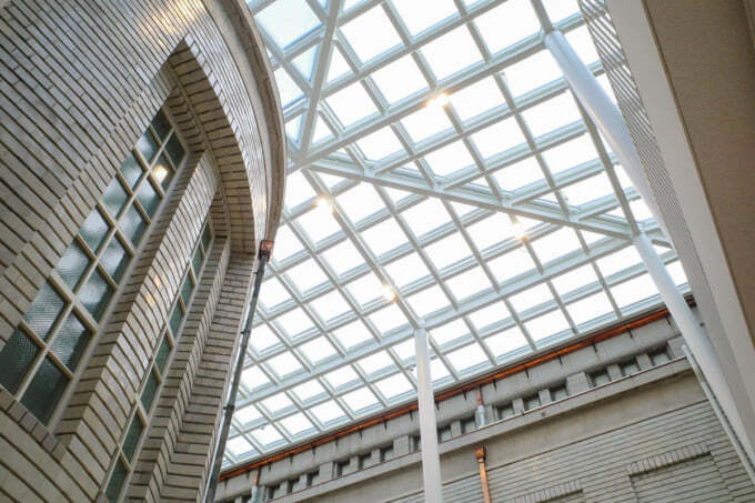 흐르는 유리 리본의 라인은 본관의 중후한 디자인과는 호대조. 역사를 존중하면서도 미래를 지향하는 미술관의 스탠스를 상징하고 있습니다. 반대로 입구에서 유리 너머로 바라 보는 교토의 하늘도 인상적입니다.