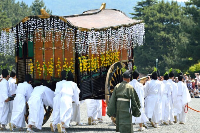 국내의 축제 중에서 가장 우아하고, 고취가 풍부한 축제로서 유명한 「아오이 축제」. 헤이안 귀족의 모습으로 교토고쇼에서 카미가모 신사까지 걷는 모습은, 마치 타임 슬립한 것 같은 기분을 맛볼 수 있습니다. 행렬을 선도하는 기마대, 라이지리(김치)로부터 본열의 마지막에는 풍류 우산(후류가사)까지, 총 500명에 의한 행렬은 바로 압권. 약 5시간에 걸쳐 교토고쇼에서 가와라마치도리, 시모가모 신사를 거쳐 가미가모 신사까지 가므로 볼 만한 곳이 있습니다.