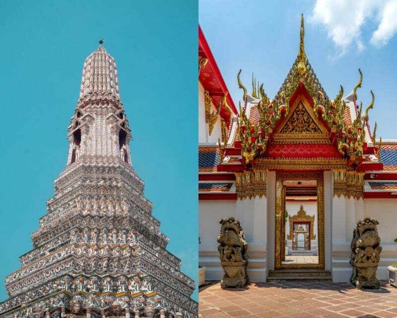 왓 아룬(Wat Arun)은 왓 아룬 랏차와라람 랏차와라마하위한( Wat Arun Ratchawararam Ratchawaramahawihan) 또는 새벽 사원 으로도 알려져 있습니다 . 방콕의 랜드마크인 많은 방문객들은 특별한 건축물을 엿보기 위해 이 불교 사원을 방문하는 것을 좋아합니다. 반면에 왓 포( Wat Phra Chetuphon Wimon Mangkhalaram Rajwaramahawihan ) 또는 왓 포(Wat Pho )는 도시에서 가장 오래되고 큰 사원 단지 중 하나이며, 화려한 건물과 황금색 와불로도 인기가 높습니다.