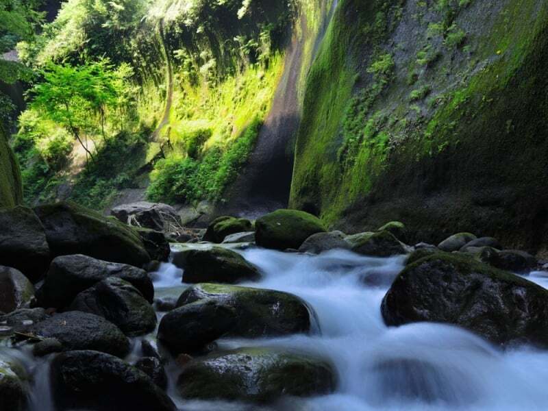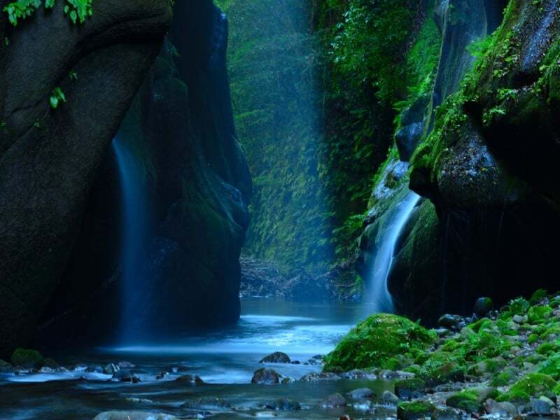 유후시 와 벳푸시를 가로 지르는 유후강을 따라 펼쳐진 유후 가와 협곡 은 자연의 아름다움으로 유명한 12km 길이의 협곡 입니다 . 경이로운 경치에는 이끼로 뒤덮인 바위와 수많은 폭포가 있습니다.
