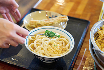쫄깃쫄깃한 식감이 주류 속에서 가늘고 코시도 있어 먹기 쉬운 구식 사누키 우동을 답습. 손님이 끊이지 않는 번성점에서 주문한 우동은 자리에서 지불.