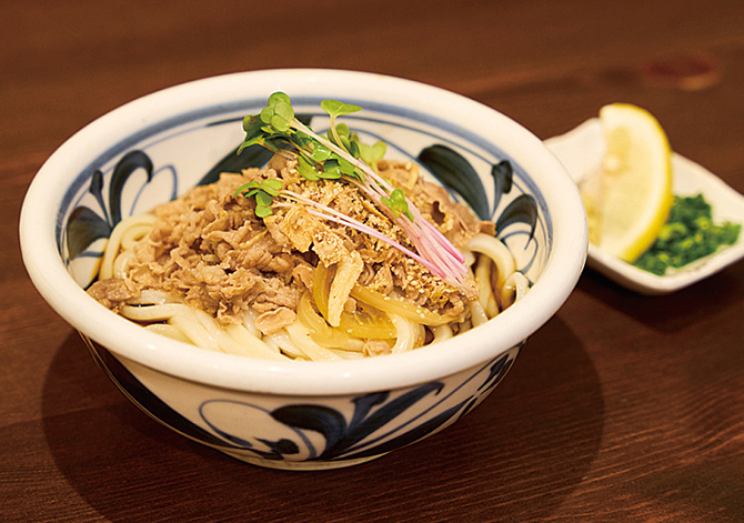 고기 부카케 우동 650엔. 쇠고기와 양파는 단단히 양념되어 단맛이 느껴진다.