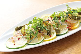 에히메현산 신선한 진 도미의 카르파치오 1100엔. 레몬의 신맛과 향기가 돋보이는 상쾌한 맛