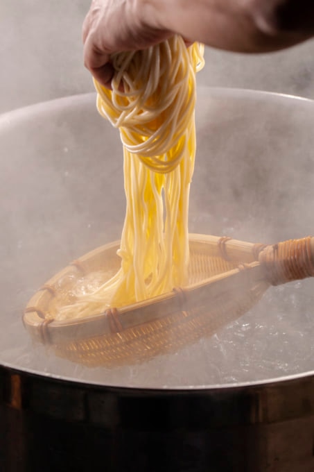 고마쓰시에 있는 「나카이시 식품공업」이라고 하는 제면소에서 만들어져 있어, 공동으로 전용의 태면을 개발했을 정도의 열정이었습니다.