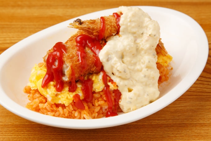 헌튼 라이스는 케첩 라이스 오므라이스에 흰살 생선 튀김과 케첩 타르타르 소스를 토핑한 가나자와의 당지 음식입니다.