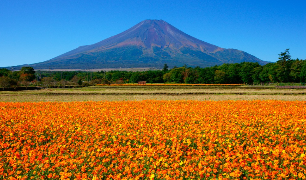 가을의 벚꽃이라 불리는 코스모스는 9월까지 후지산 옆에 만발하며, 꽃공원은 입장료가 무료입니다!