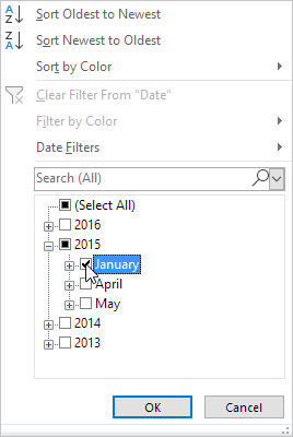 4. 모두 선택을 클릭하여 모든 확인란의 선택을 취소하고 2015 옆에 있는 + 기호를 클릭한 다음 1월 옆에 있는 확인란을 클릭합니다.