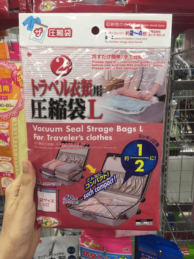 쇼핑을 마치고 짐에 모든 것을 넣을 수 없나요?? 진공 밀봉 백은 짐에 여분의 공간을 만드는 데 매우 유용하며, 완전히 재사용 가능하고 놀랍게도 100엔에 불과합니다!!