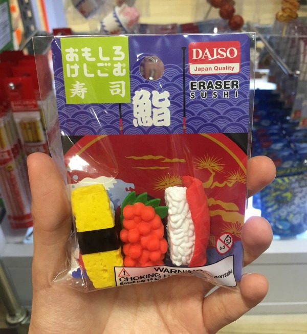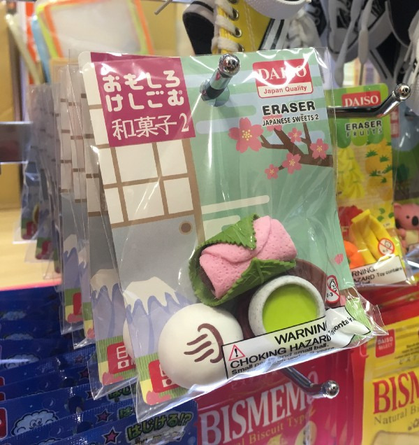 독특한 지우개는 외국인 방문객에게 가장 많이 팔리는 기념품 중 하나이며, 100엔에 살 수 있다는 건 얼마나 놀라운 일인가요? 저는 다이소 매장에서 인상적인 지우개 셀렉션을 발견했습니다!