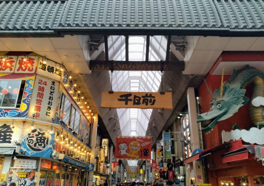 센니치마에 쇼핑 거리(千日前商店街)는 오사카에서 쇼핑과 식사를 즐기며 지역 분위기를 느낄 수 있는 인기 있는 장소입니다. 이 길은 600미터에 걸쳐 전통적인 상점, 현대적인 부티크, 기념품 가게, 그리고 오사카의 유명한 길거리 음식들을 파는 현지 음식점들이 있습니다.