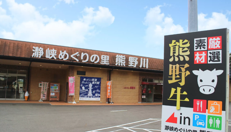도로협곡 투어의 거점이 되는 ‘구마노강 메구리노사토 구마노가와(熊野川めぐりの里 熊野川)’는 구마노강의 맑은 물소리와 함께 사계절의 자연을 느낄 수 있는 드라이브인입니다.