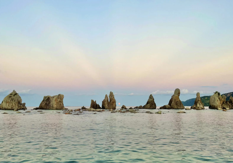 '하시구이이와(橋杭岩)'는 바다에서 줄지어 솟아오른 40여 개의 기암으로, 일본 100대 해돋이·해넘이 명소 중 하나입니다.