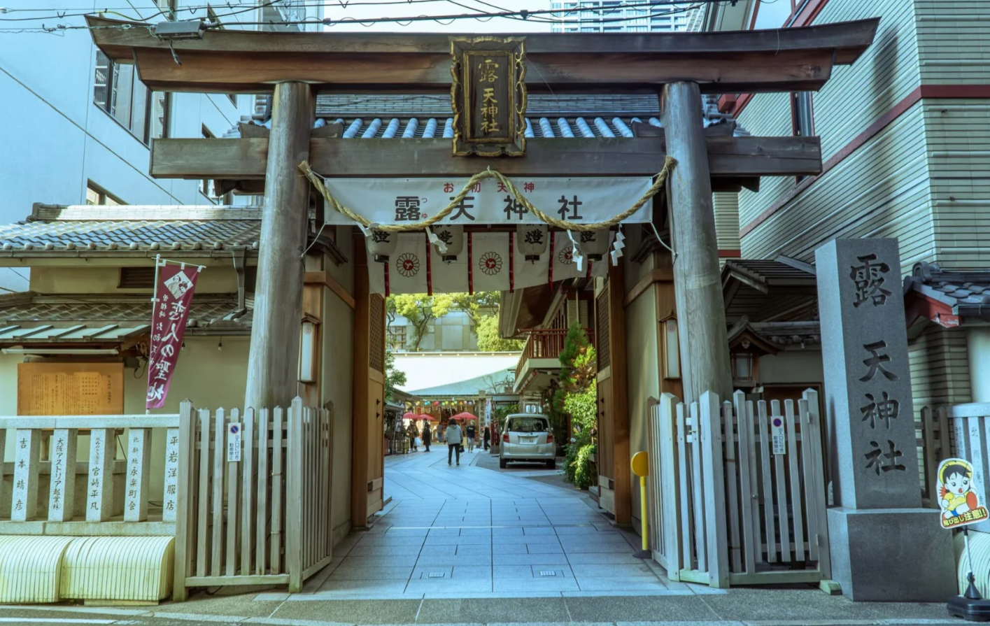 ‘오하츠 텐진’은 18세기의 유명한 비극 로맨스 실화를 바탕으로 한 신사입니다. 사랑하는 연인 ‘오하츠’와 ‘도쿠베이’의 이야기로 잘 알려져 있으며, 지금도 많은 커플들이 영원한 사랑을 기원하며 이곳을 찾습니다.