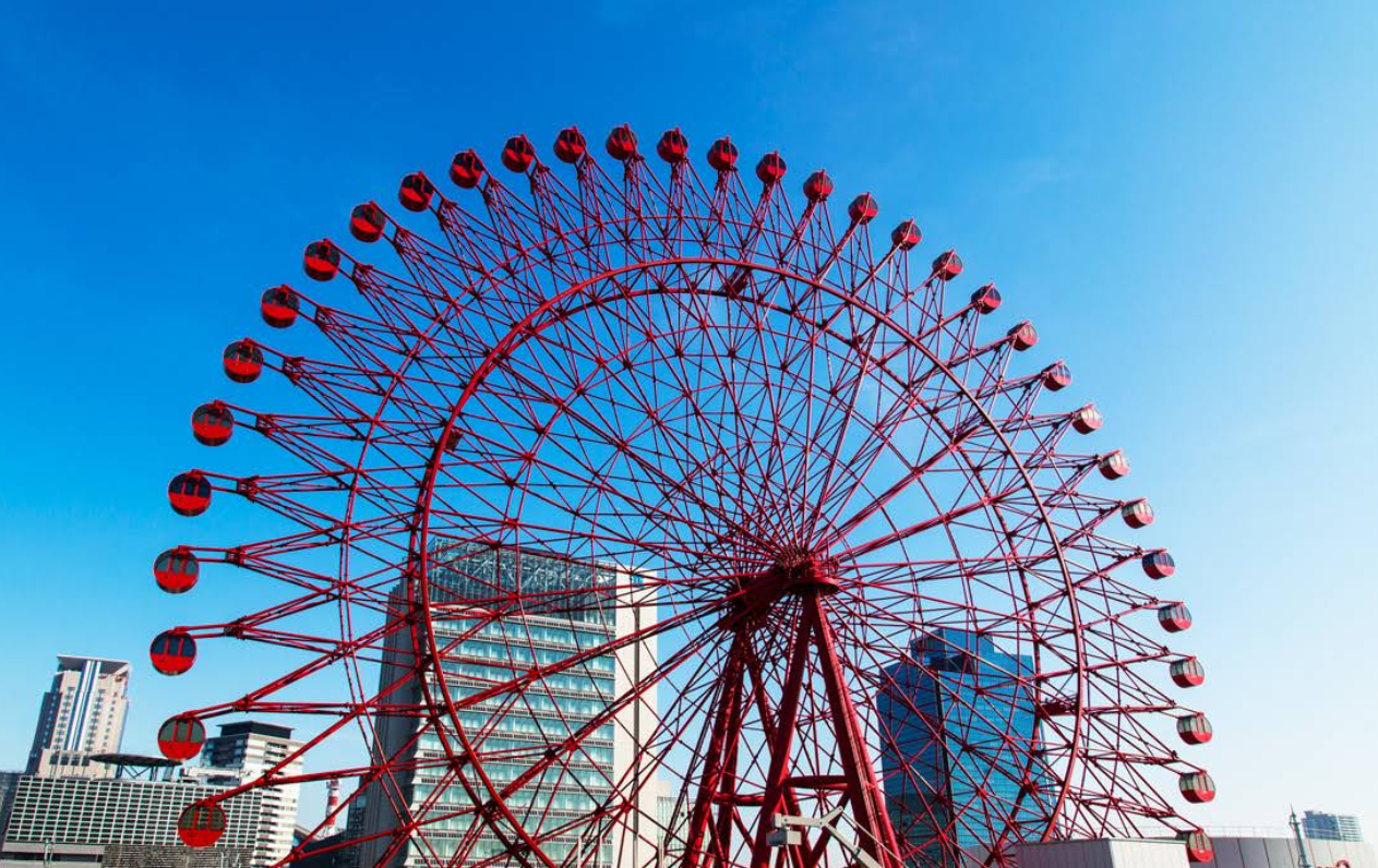‘HEP FIVE’ 쇼핑몰 옥상 위에 설치된 빨간 대관람차는 우메다를 대표하는 포토 스팟입니다. 106미터 높이에서 내려다보는 오사카 시내 풍경은 물론이고, 대관람차 자체가 하나의 예술작품처럼 독특한 포토 배경이 되어 줍니다.
