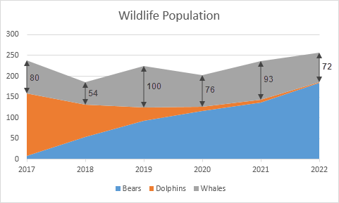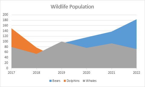영역 차트 는 선 아래 영역이 색상으로 채워진 선 차트입니다. 누적 영역 차트를 사용하여 시간 경과에 따른 합계에 대한 각 값의 기여도를 표시합니다.