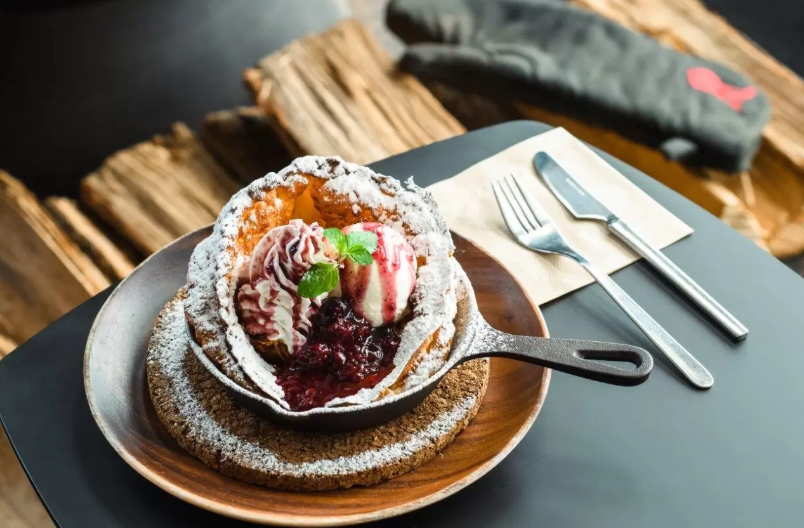 전망 테라스 카페에서는 지역 파티시에가 만든 독일식 팬케이크 "더치베이비"를 재해석한 "유키야마 팬케이크(雪山パンケーキ)" 가 인기 메뉴입니다.