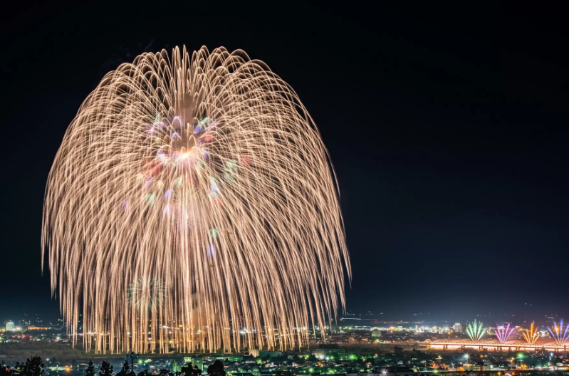 나가오카 불꽃놀이의 상징이라 할 수 있는 쇼산샤쿠다마(正三尺玉)는 일본에서 허가된 최대 크기의 불꽃입니다. 지름 90cm, 무게 300kg, 폭약량 80kg에 달하는 이 불꽃은 하늘 위에서 무려 지름 650m 규모의 거대한 구름꽃을 피워냅니다. 압도적인 크기와 소리, 섬세한 색감으로 관람객 모두를 매료시키며 나가오카를 대표하는 장면을 만들어냅니다.