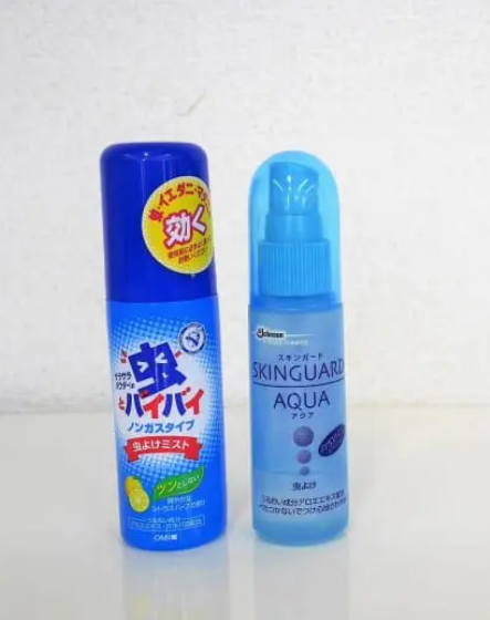 미스트 타입의 방충제인 무시토 바이바이(200ml 약 300엔)와 스킨케어 아쿠아 가드(50ml 약 400엔)는 스프레이 캔보다 작고 휴대하기 편리해서 더 인기가 높습니다. 이 제품들은 피부에 발라도 끈적거리지 않아 사용감이 우수합니다.