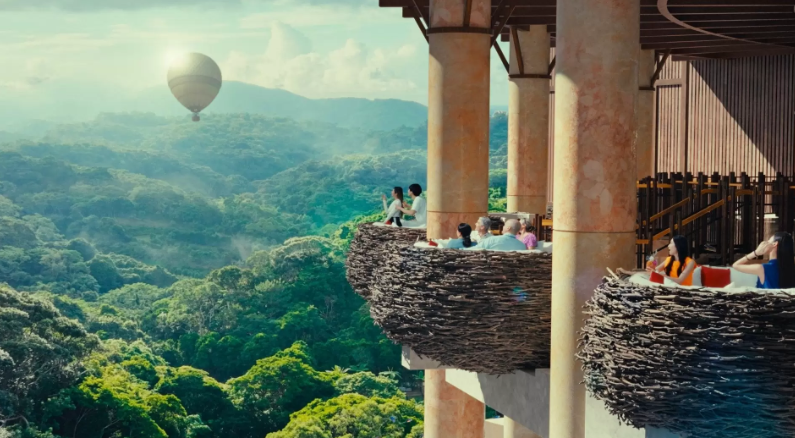 파노라마 다이닝은 정글과 하늘의 숨막히는 파노라마 뷰를 자랑합니다. 유리벽과 높은 천장이 있는 넓고 개방적인 디자인이 밝고 통풍이 잘 되는 분위기를 조성합니다. 새둥지에서 영감을 받은 독특한 야외 좌석이 매력을 더합니다.
