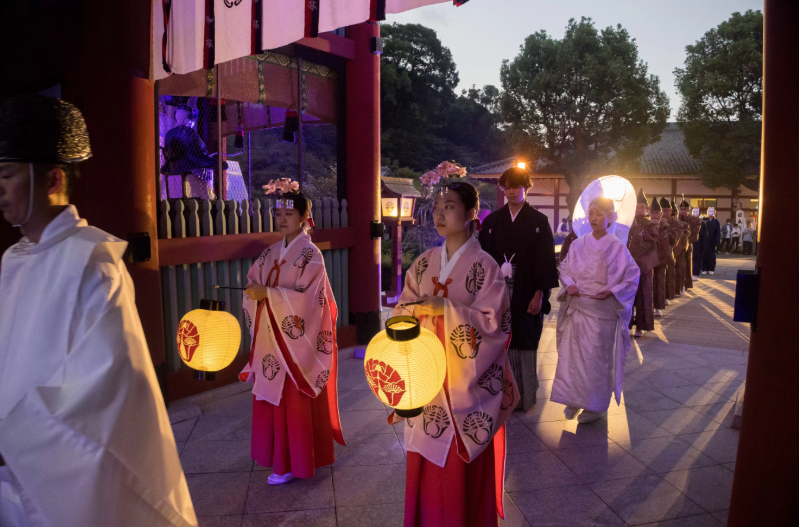 여우 결혼 행렬은 신관과 여우 가면을 쓴 신랑신부, 그리고 가가쿠(전통 일본 악기) 악단이 절 마을에서 신사 경내까지 행진하는 신성한 의식입니다. 이 행렬을 통해 빛과 소리, 환상과 신화가 하나로 어우러지는 특별한 순간을 체험할 수 있습니다.