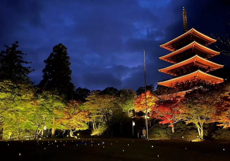 오층탑의 조명은 특히 인상적인데, 전통 일본 건축의 우아한 실루엣이 어둠 속에서 더욱 돋보이며 주변 단풍나무들과 어우러져 한 폭의 그림 같은 풍경을 연출합니다. 본당과 산문, 종루까지 이어지는 조명은 사찰 전체를 환상적인 분위기로 감싸며, 마치 다른 세계에 온 듯한 착각을 불러일으킵니다.