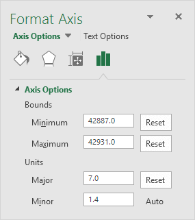 8. 날짜 및 시간은 Excel에서 숫자로 저장되며 1900년 1월 0일 이후의 일 수를 계산합니다. 2017년 6월 1일(시작)은 42887과 동일합니다. 차트의 날짜를 마우스 오른쪽 버튼으로 클릭하고 축 서식을 클릭하고 최소 경계를 42887로, 최대 경계를 42931로, 주요 단위를 7로 고정합니다.