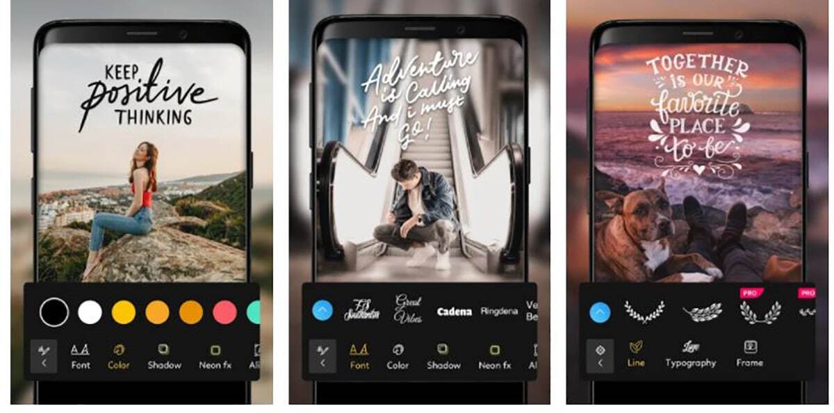 매우 앱 600.000 개 이상의 리뷰와 함께 설치 그 자체로 텍스트를 추가하는 데 사용할 수있는 강력한 사진 편집기입니다. 우리가이 단락에서 언급 한 것들까지의 거리라는 훌륭한 디자인을 가진 매우 우아한 응용 프로그램입니다. 그것은 가지고있다 모양, 테두리, 텍스처 및 오버레이를위한 100 개 이상의 템플릿, 9 개의 필터로 사진을 꾸미고 텍스트를 추가 할 수 있습니다. 네, 많은 홍보물을 찾을 수있는 앱이므로 시도해보고 귀찮은 지 평가하는 것이 좋습니다.