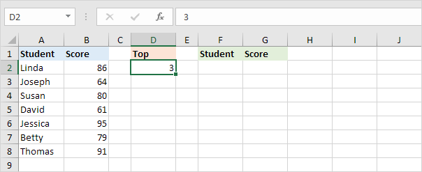 1. 상위 3개 결과를 보여주고자 합니다. D2 셀에 값 3을 입력합니다.