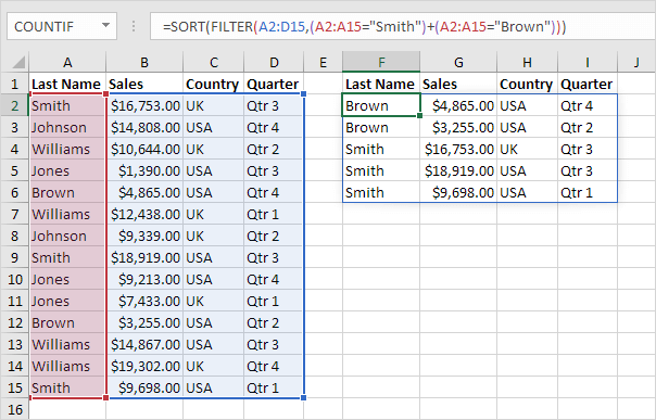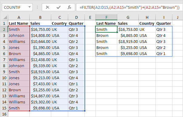 5. 아래의 FILTER 함수는 더하기 연산자(+)를 사용하여 성이 "Smith" 이거나 성이 "Brown"인 모든 레코드를 추출합니다.