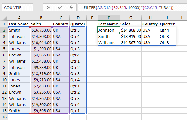 4. 한 단계 더 나가면, 아래 FILTER 함수 는 곱하기 연산자(*)를 사용하여 매출이 $10,000보다 크고 국가가 "미국"인 모든 레코드를 추출 합니다.