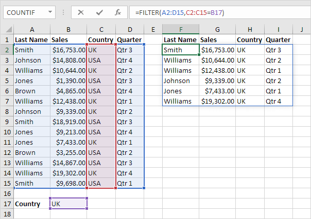 2. 아래의 동적 FILTER 기능은 모든 영국(UK) 레코드를 추출합니다.