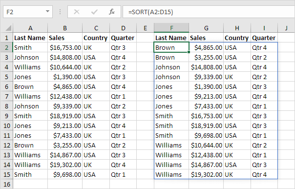 1. 아래의 간단한 SORT 함수에는 단 하나의 인수(A2:D15)만 있습니다. 기본적으로 SORT 함수는 첫 번째 열을 기준으로 오름차순으로 정렬합니다.