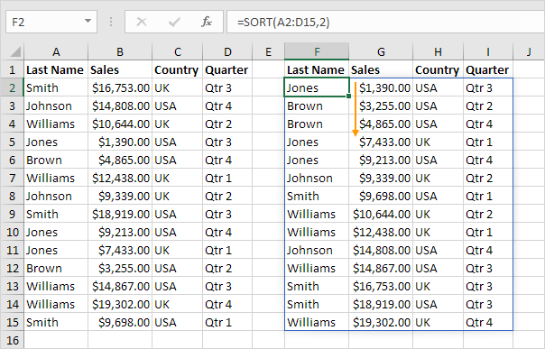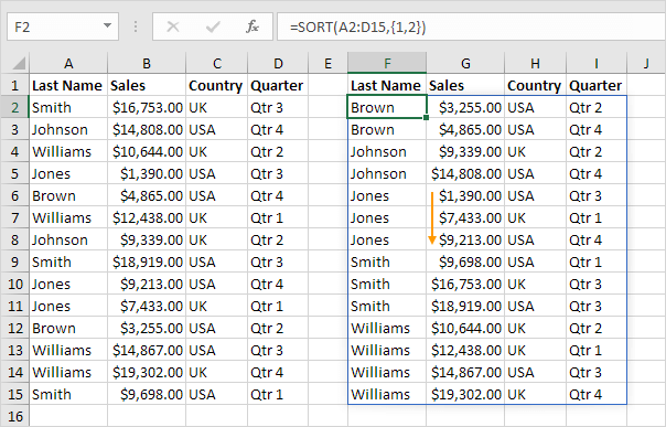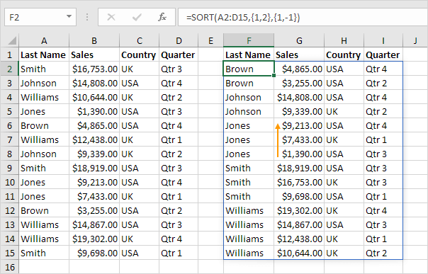 4. 여러 열을 정렬하려면 배열 상수를 제공하기만 하면 됩니다. 예를 들어, 성(Last Name)이 먼저이고 판매(Sales)가 두 번째로 정렬됩니다.