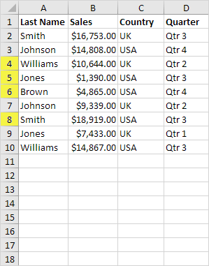 4. 예를 들어 성 및 국가가 동일한 행을 제거합니다.