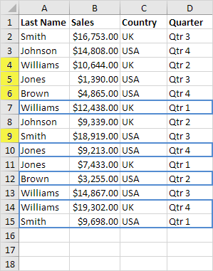 * 결과: Excel은 발견된 첫 번째 인스턴스(노란색)를 제외하고 동일한 성 및 국가(파란색)를 가진 모든 행을 제거합니다.